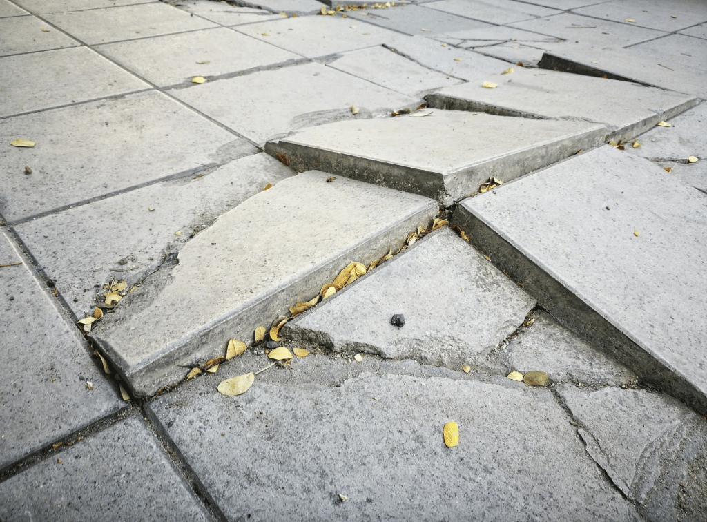 - Cracked sidewalks and uneven pavement